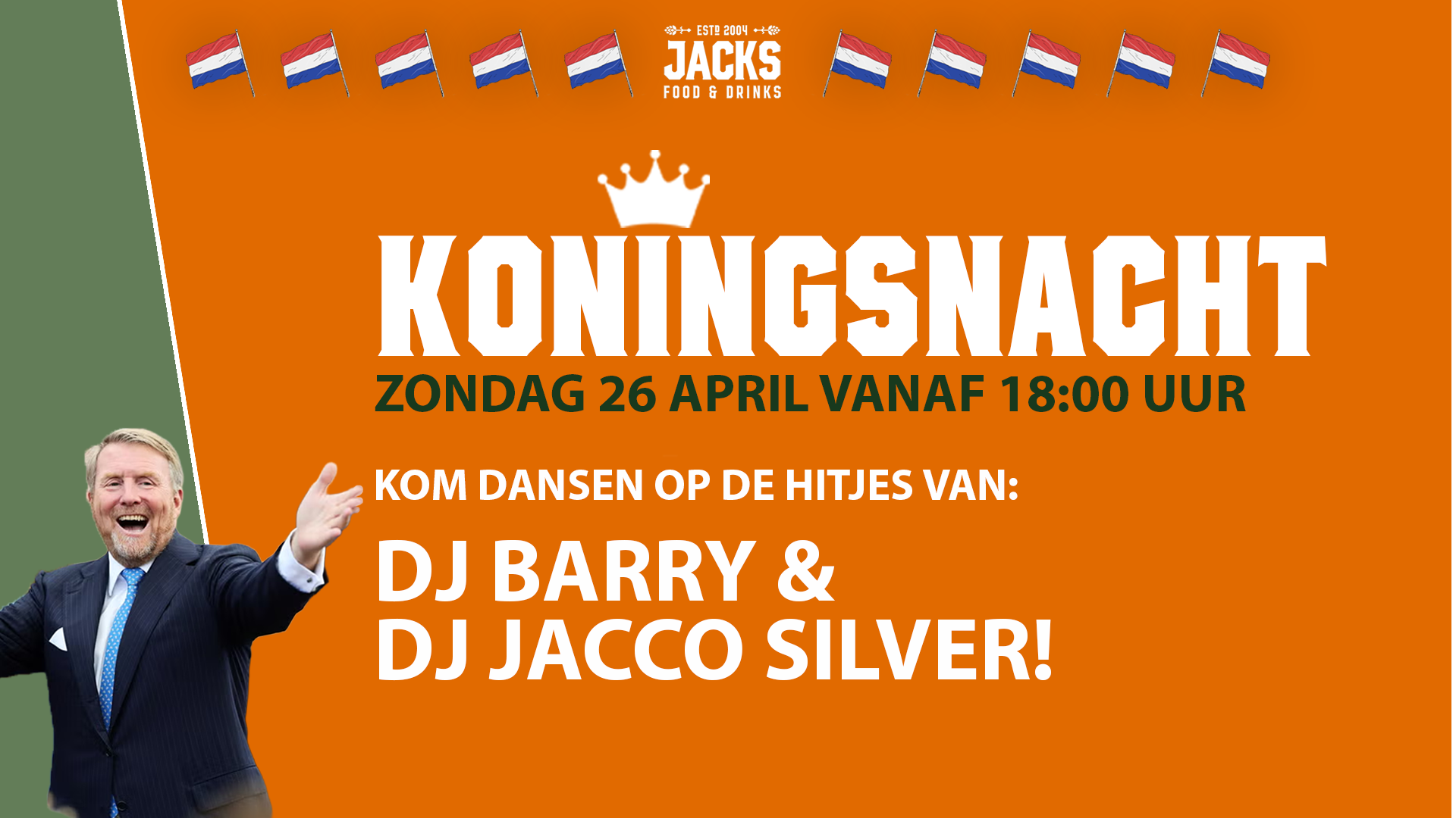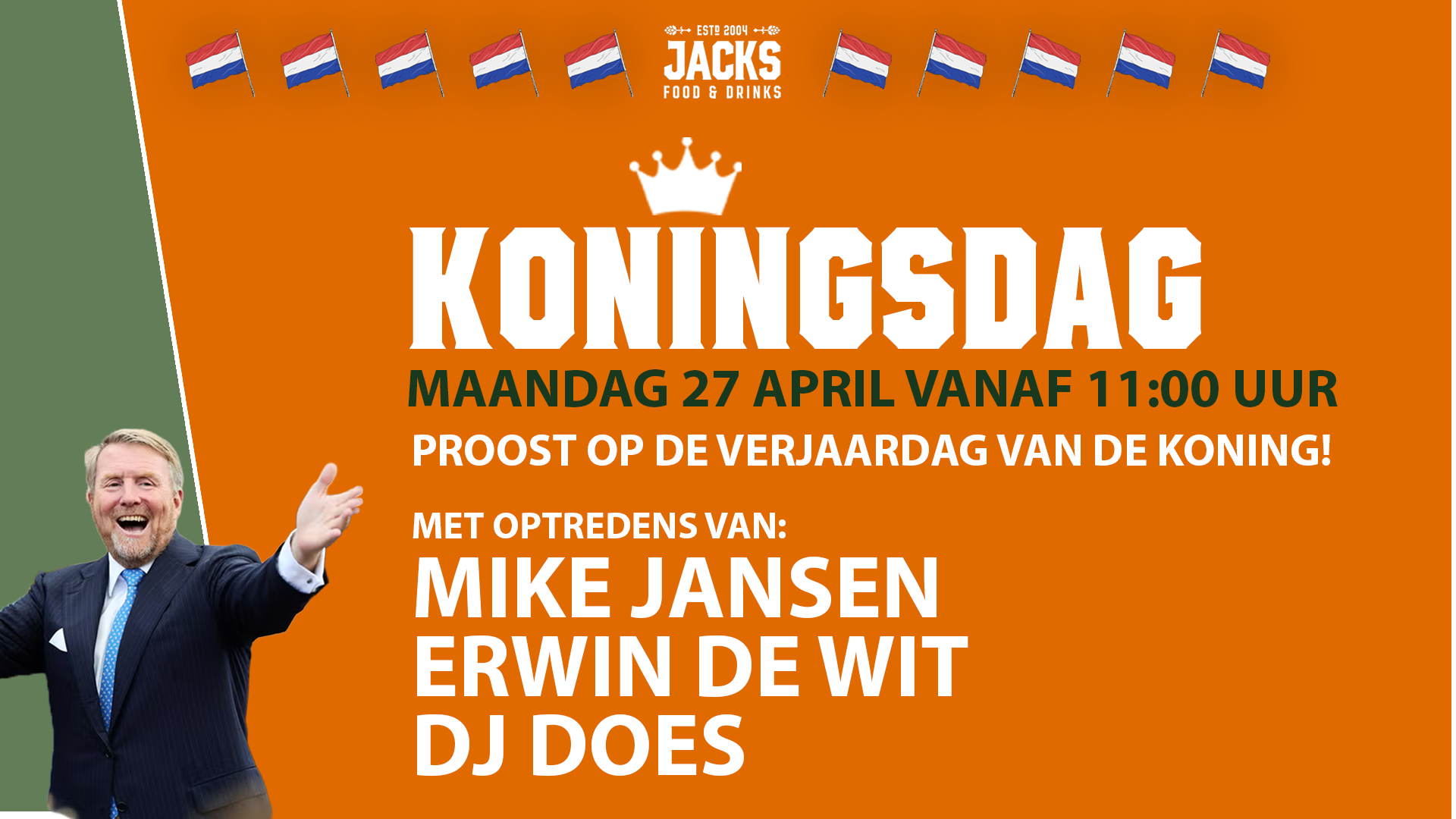 KONINGSDAG bij JACK’S – 27 APRIL! Op Koningsdag zetten we Jack’s in Heemskerk op z’n kop met een knallend oranje feest! Mike Jansen Erwin de wit DJ DOES De lekkerste meezingers en... |